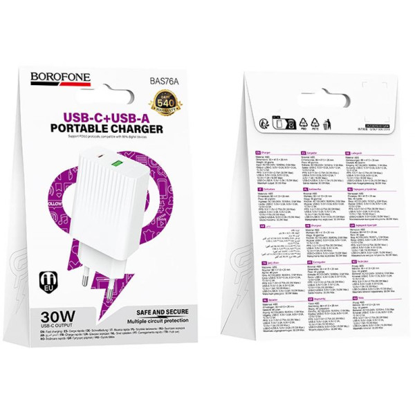 Зарядний пристрій Borofone BAS76A Source PD30W+QC3.0 — це ідеальне рішення для тих, хто цінує швидкість та надійність. Воно призначене для використання з різними мобільними пристроями та пропонує оптимальну продуктивність завдяки підтримці технологій швидкої зарядки.
